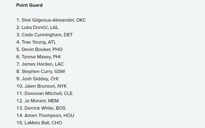 从控卫榜单不难看出,美媒在这份榜单的评价中非常看重年龄与潜在成长性,因此导致像库里这种超级巨星屈居第八名。