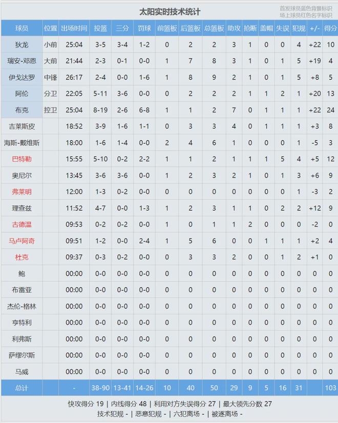 第四节双方派上替补,太阳10号秀卡曼-马卢阿奇登场亮相,进攻端出手机会不多。湖人替补后卫RJ-戴维斯连续砍分,他只是Exhibit-10合同。全场结束,太阳103-81大胜湖人22分,太阳内线得分48比22完爆湖人,助攻29比10!