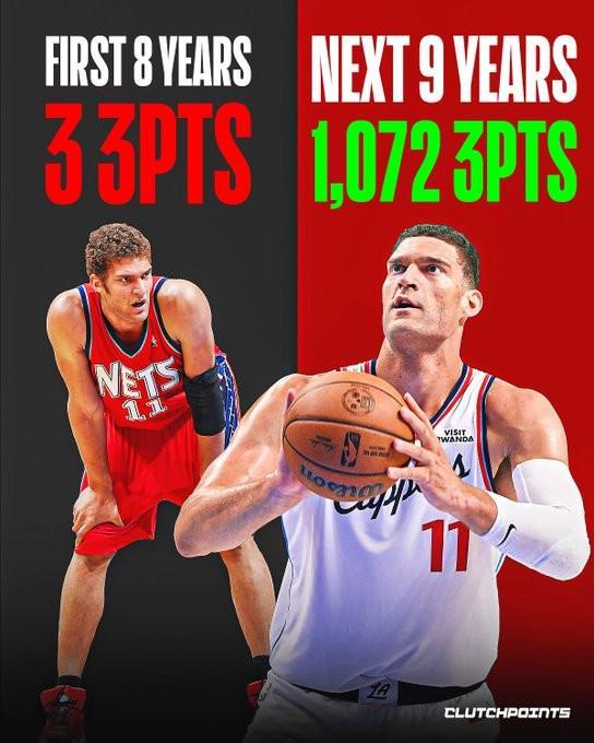 近日,美媒ClutchPoints晒出一项关于快船队老将布鲁克-洛佩兹的数据。大洛佩兹在生涯中经历了角色转型,这在他的三分命中数这项数据上显著体现。