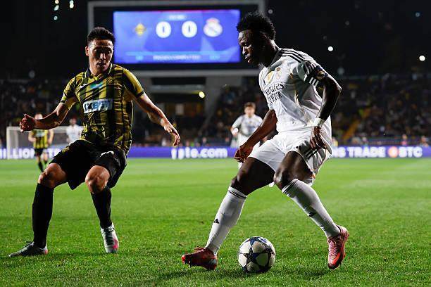开场后皇马毫无身价碾压对面百倍的观感,甚至在开场前15分钟内,除了维尼修斯错失的一次单刀射门几乎毫无机会,反而是凯拉特借主场之势打出了几次射门。凯拉特能在欧冠资格赛附加赛两回合零封凯尔特人,证明该队的防守有一定水准。整个上半场,进攻线主力尽出的皇马基本没制造出太多破门机会,如果不是凯拉特门将扑倒马斯坦托诺送点,皇马怕是很难在中场休息前打开僵局。