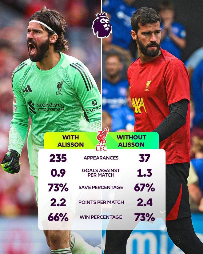 英超官方晒利物浦有无阿利松对比:场均丢球增多,但胜率更高