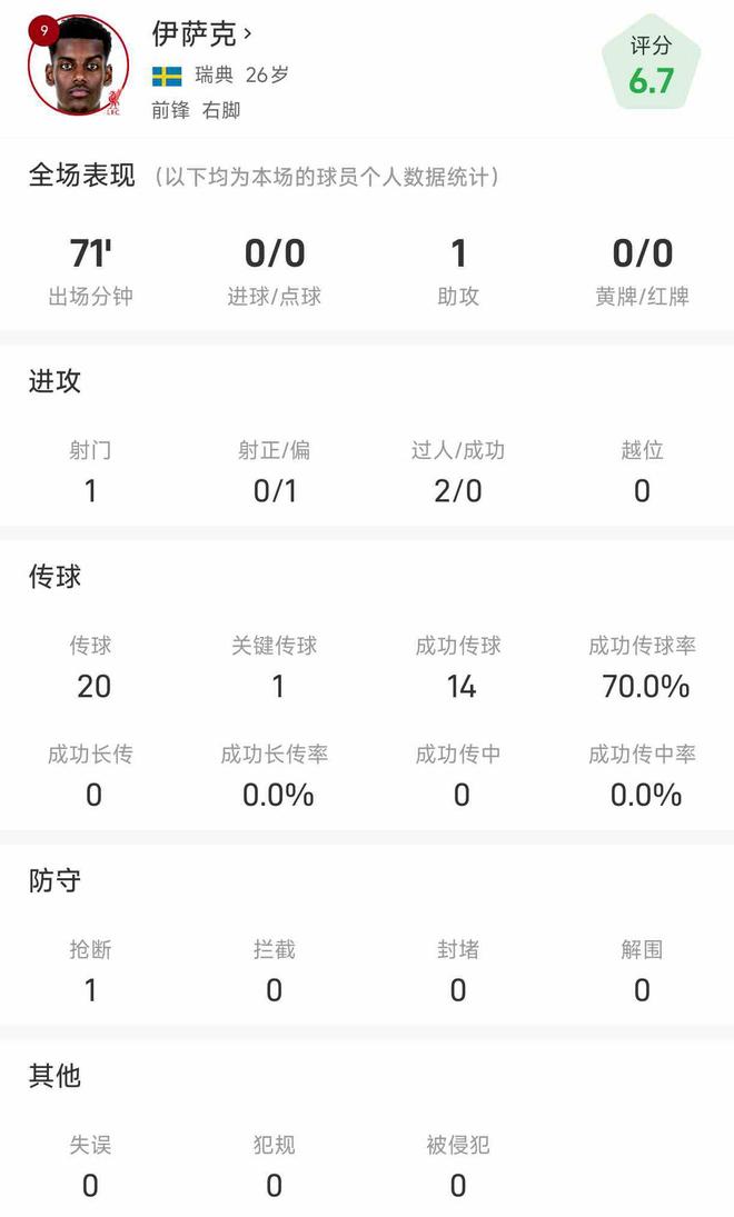 雷速体育10月5日讯 北京时间今天凌晨,英超第7轮,利物浦客场对阵切尔西。本场比赛伊萨克出场71分钟后被换下。