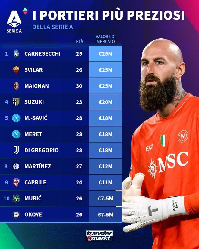 北京时间10月9日,在更新了意甲球员的身价之后,德转还列出了此次更新后意甲身价排名前10的门将,亚特兰大的卡尔内塞基、罗马的斯维拉尔以及AC米兰的迈尼昂同以2500万欧元并列第二,帕尔马的日本国门铃木彩艳2000万欧元排名第四。